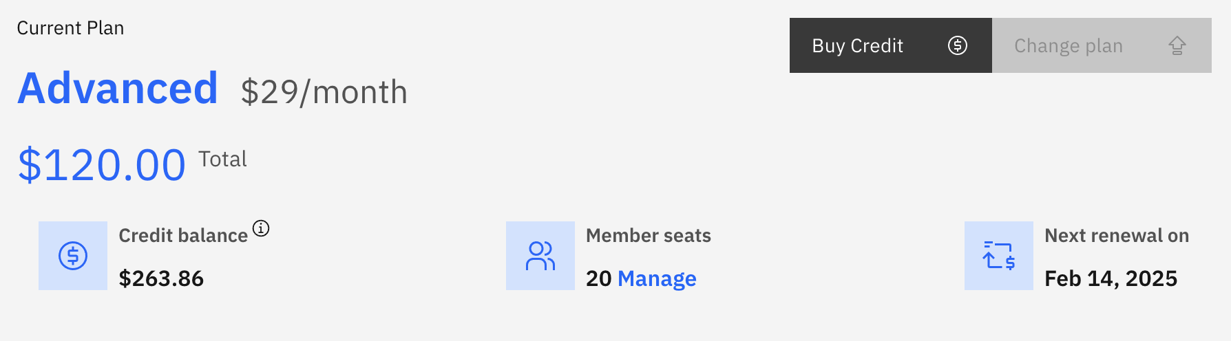 * **요금제 이름:** 현재 구독 요금제의 이름(예: "무료 체험", "필수", "고급").